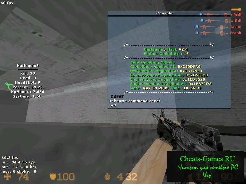 У Harlequin есть еще встроенный wallhack для cs 1.6 главная наверно его особенность от других wh помимо основный стандартный функций по обнаружению близ стоящих целей по котором возможен огонь на поражения это мини статистика которую он ведет в левом углу как показано на скриншоте, ведь согласитесь очень удобно знать какой процент попаданий у вас если вы играете с выключенным aimbot (система автоматического наведения прицела на объекты по которым возможно открыть огонь на поражения). Если вам понравился чит то жмите на картинку что расположена под текстом, которая позволит вам скачать aimbot для cs 1.6 .
