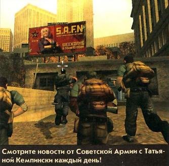 Возможно, когда Freedom Fighters 2 только разрабатывалась, датчане из Interactive просто готовили игру перво-наперво под американский рынок, стараясь максимально угодить целевой аудитории. Но вот ведь шутка судьбы - FF умудрилась выйти через полгода после захвата Ирака теми же США. Это я к чему: генерал Татарин в игре устраивает пресс-конфе-ренции и авторитетно заявляет, что СССР пришли с миром - пришли, чтобы установить в регионе порядок и стабильность; выпуски новостей между миссиями демонстрируют колонны техники, проезжающей по ликующим улицам города, и кадры оперативной съемки, показывающей захват спецслужбами логова террористов. Согласитесь, переложение всего этого на сегодняшнюю реальность просто напрашивается.