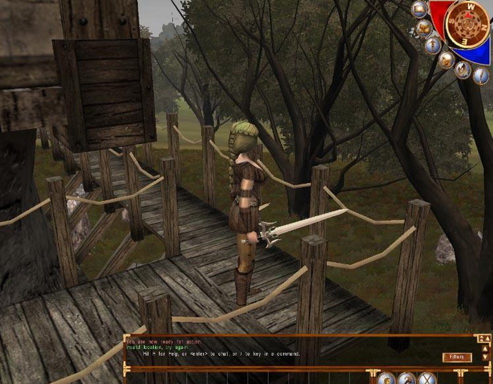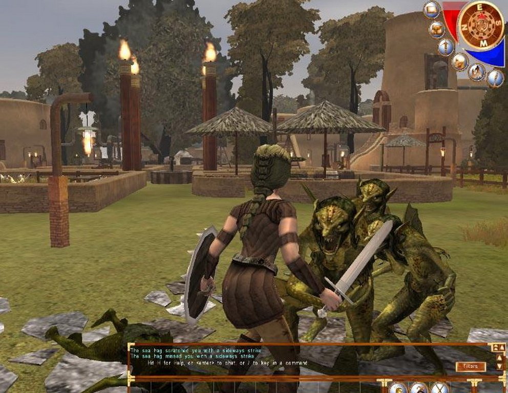 Сразу после рождения чар помещается в ограниченный район с несколькими городами, где временно проживают все ньюбы. Вообще, понятие ограниченности само по себе довольно размыто. Даже этот район боевых действий велик, так что побегать придется много. А уж тварей разных -так это выше крыши, начиная с безвредных и неагрессивных и заканчивая настоящими монструозными образованиями. Агрессивность каждого гада обозначается цветом. Зеленый - самый мирный, никогда не нападет первым; красный атакует сразу и беспощадно. Но уровень монстра узнать пока не представляется возможным. Он ведь может быть и настоящим агрессором, но иногда завалить его можно с одного удара. Кроме этого, у некоторых видов есть инстинкт стаи - валишь одного, а на его писк сбегается вся округа, только держись.