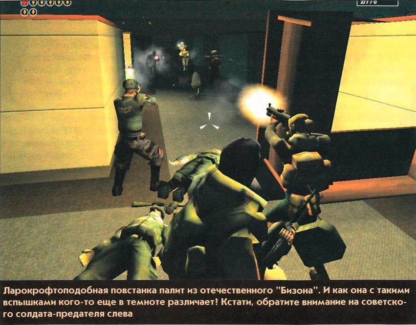 Из-за достаточно сообразительного AI в игре Freedom Fighters управление бойцами сделано чрезвычайно простым и в то же время функциональным. Всего в игре используются три команды: "за мной", "охранять" и "разведать боем". Все очень просто: наводишь прицел на желаемое место на земле (сколь угодно далеко или близко) и либо жмешь на "охранять", либо "разведать" - над указанным местом появляется соответствующая иконка - и один из бойцов срывается с места, побежав выполнять приказ. Сколько раз приказал, столько бойцов и побежало. Быстро и удобно, хотя и не слишком изящно: к концу игры под вашим командованием собирается 12 человек (максимальный отряд), и долбить по клавишам приходится не хуже дятла. Впрочем, оно себя окупает: когда в атаку идут 12 повстанцев, тут уж можно просто спокойно топать сзади, только отдавая новые зы и подлечивая павших бойцов (они тут редко умирают насовсем - обычно просто падают и ждут, когда придет главгерой и поюзает аптечку). Впрочем, разработчики благоразумно не дали никому из NPC тяжелого вооружения или снайперских винтовок, так что даже с такой гурьбой подчиненных для главгероя всегда найдется работа по выносу пулеметчиков, танков и вертолетов.